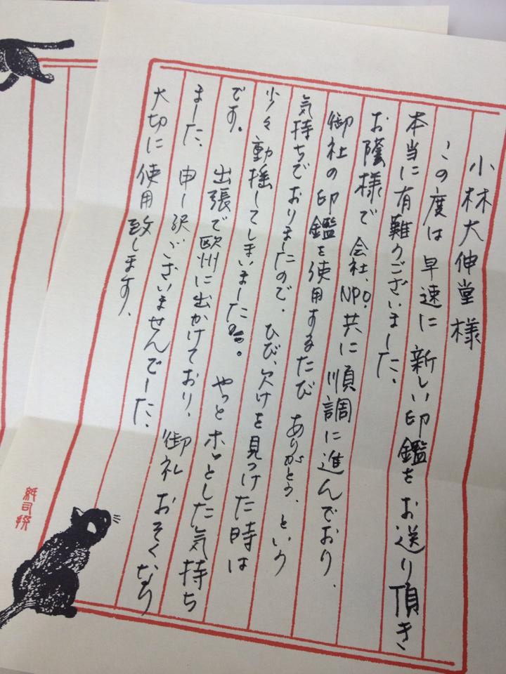 この度は早速に新しい印鑑をお送りいただき本当にありがとうございました。