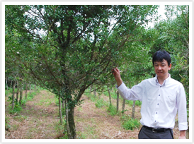 以前から、薩摩地方では柘植の木を植林していると聞いていましたので、訪問前はてっきり山の奥にたくさんの柘植の木が植林されているものとばかり思っていました。しかし、実際には農家の庭先や畑のとなり、休耕地など家のまわりの平地や小高い丘の上に整然と植林されていてびっくりしました。